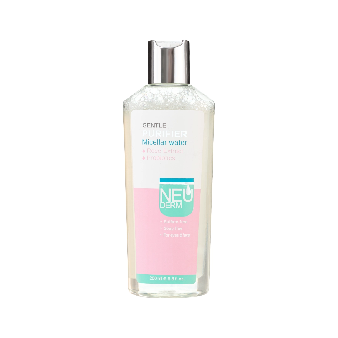 پاک کردن آرایش از صورت باید با استفاده از محصولات پاک کننده مخصوص این کار انجام شود. میسلار واترها از این دسته محصولات هستند. محلول میسلار واتر جنتل پیوریفایر نئودرم با عصاره گل رز برای انواع پوستها مناسب است. همچنین با آبرسانی و مرطوب کنندگی قوی، پوست را شاداب کرده و سلامتی را به آن هدیه میکند. محلول میسلار واتر جنتل پیوریفایر نئودرم مناسب انواع پوست است. این میسلار واتر، انواع آرایش بر پایه آب و بر پایه روغن را به آسانی از صورت برداشته و آلودگیها را با ملایمت از روی پوست پاک میکند. در فرمولاسیون این محصول، عصاره گل رز نقش بسیار موثری در رطوبت رسانی به پوست دارد. همچنین به رفع تحریکات پوستی کمک کرده و لطافت پوست را در مقابل آلودگیها حفظ میکند. حجم این محصول ۲۰۰ میلی لیتر است. پروبیوتیک در این محصول مانند یک واکسن روی پوست شما عمل کرده و سیستم ایمنی سلولی آن را فعال و بافت پوست را ترمیم میکند. این محلول با فرایند میسلازاسیون تمامی آلودگیها و چربیها را بدون ایجاد هرگونه التهابی از روی صورت برداشته و پوست را کاملا تمیز میکند. بکارگیری عصاره گل رز در کنار پروبیوتیک ها در این محصول نئودرم، ضمن پاک کردن انواع آرایش و آلودگیها، طراوت و لطافت پوست شما را حفظ میکند. میسلار واتر محصولی برای بخشیدن لطافت و طراوت به پوست صورت است. استفاده از این محصول برای پاک کردن عمقی آرایش ضروری است.